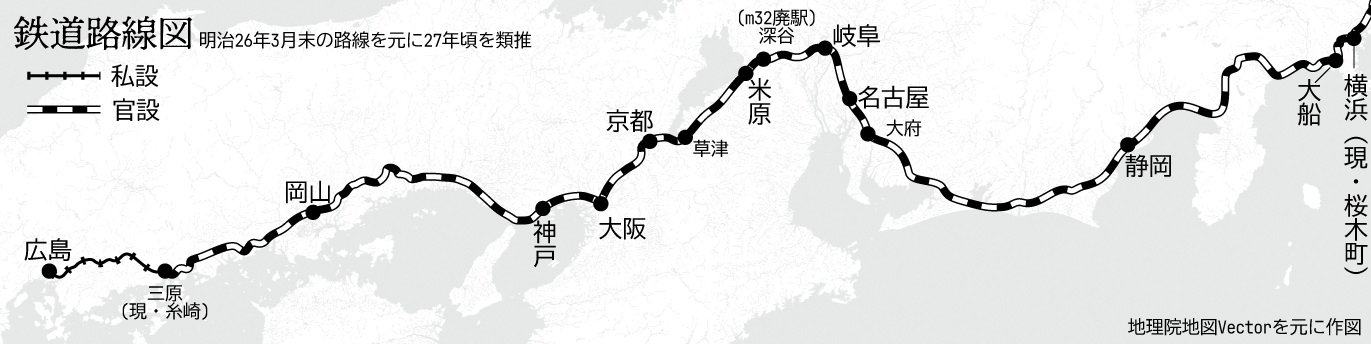 - 日本における鉄道開設当初から時刻表が定期的に出版され出すまでの時刻表をまとめたもので,ちょうど明治26年3月末の鉄道路線図(予定も含む)が180ページに掲載されています.現物も近くの図書館にあったので見たのですが,元の印刷の状態が悪いのか,官営の開業済み区間と未開業区間の違いがよく分からない.